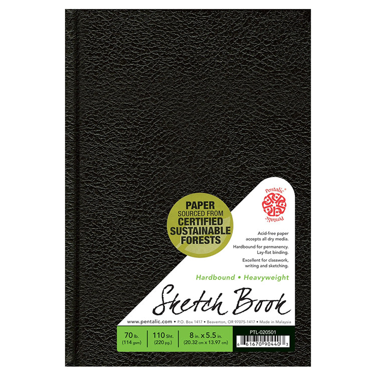 Hardbound sketchbooks contain 110 sheets (220 pages) the traditional perfect-bound binding allow the book to lie flat and drawings to flow across both pages of the sketch book.  Classic black, hard-cover sketch books have an embossed leatherette texture. These books feature acid-free, bright white, 70lb. (114 gsm) paper, sourced from certified sustainable forests, ideal for sketching, drawing, and writing in any dry media.