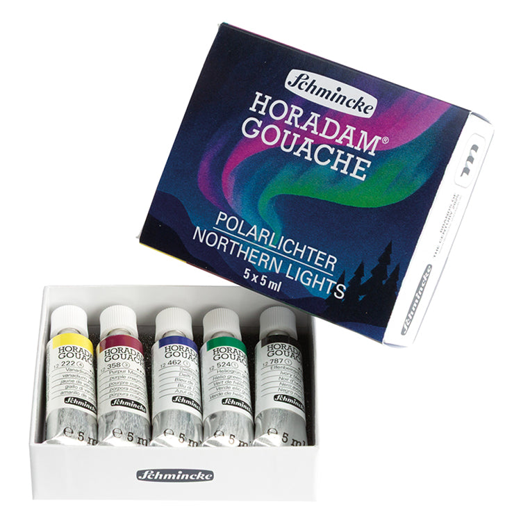 Schmincke HORADAM Gouache delivers vibrant, professional-quality color in an easy-to-use set. These five harmoniously selected Northern Lights colors feature natural opacity and velvety brilliance without added white, giving you pure, intense pigments. Use them opaque for bold coverage or dilute with water for lighter effects. Mix freely with other Schmincke gouaches and watercolors. The matte finish dries with minimal color shift, perfect for artists seeking versatile, reliable performance and creative freedom in every stroke.