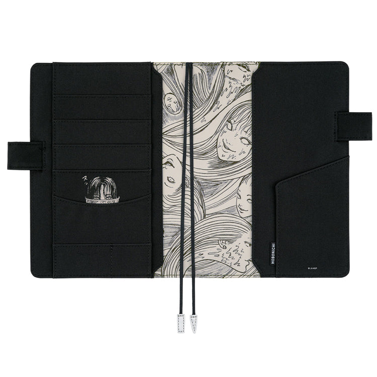 The Tomie Memory Cousin-size cover is made of luxurious silver faux leather, printed with artwork from the original Tomie manga. The illustrations are printed in black ink on a silver background, but there’s one exception—Tomie’s eyes are rendered in white ink.