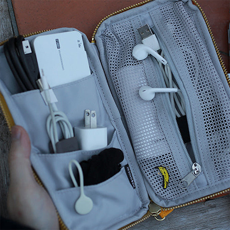 The “Drawer Pouch,” part of the Hobonichi Techo lineup, is a pouch that lets you store your favorite and important items all in one place. It’s like carrying around an organized drawer with you wherever you go. The pouch can hold many items, but its slim size and compact shape make it easy to fit into a purse or bag. A loop-shaped strap has been attached to the zipper to make it easy to hold.