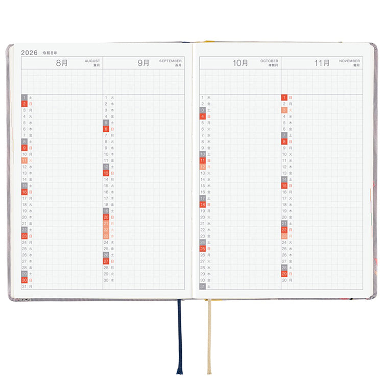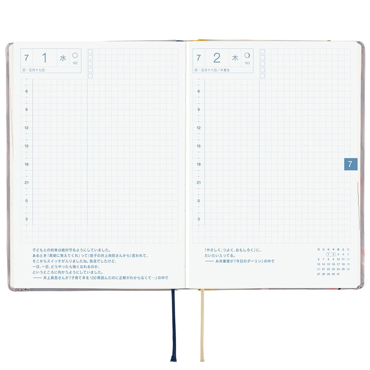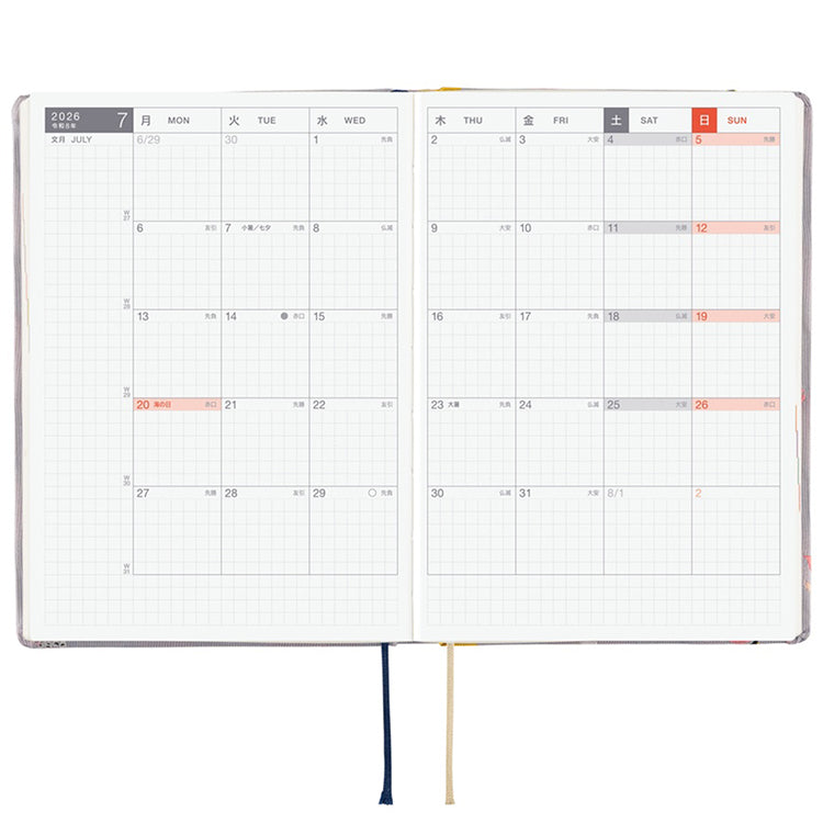 The book’s lay-flat binding and thin and light Tomoe River graph paper with 3.7 mm squares make the book easy to read and write in. The book includes a yearly calendar, yearly index, Monday-start monthly calendars, daily pages, blank memo pages and more.