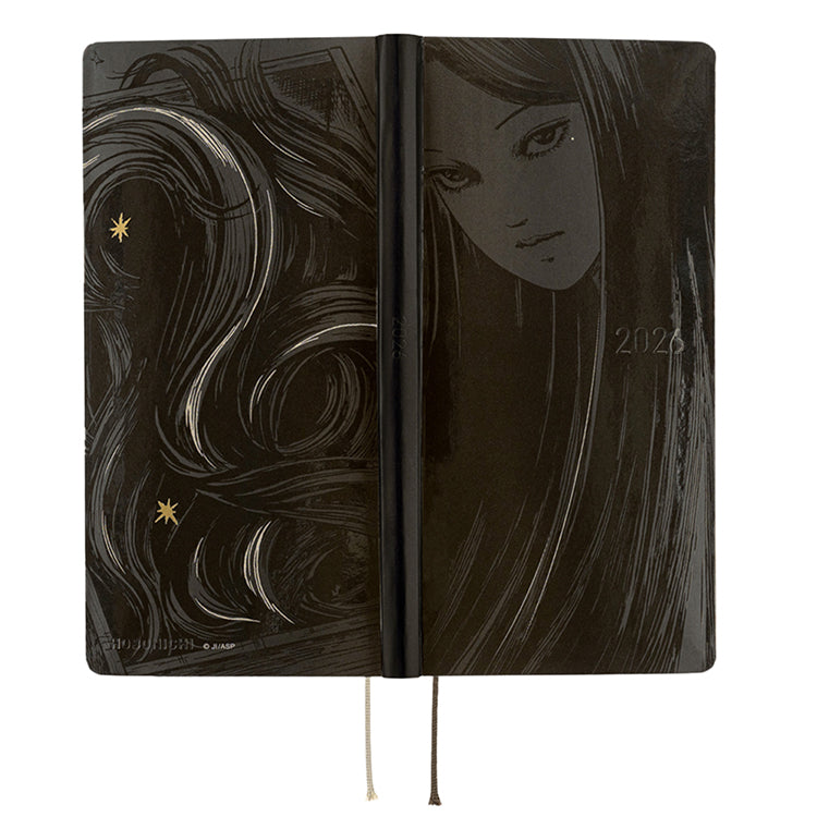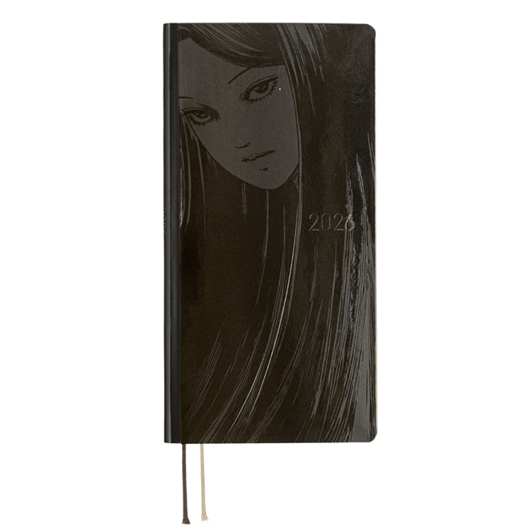 The Tomie - Haunting Beauty Weeks features an illustration of an illusory version of Tomie. Printed on a matte black cover, the image of Tomie is rendered using glossy silk screen printing to give it a subtle shine.