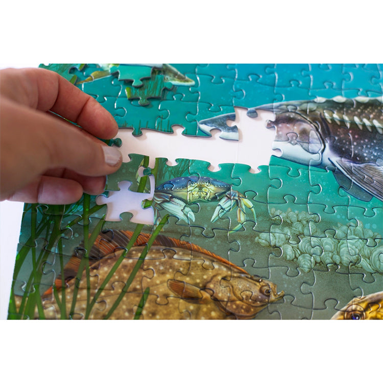 Oakland Puzzle Co. partnered with San Francisco Baykeeper to celebrate their 35th Anniversary. This scene features 16 species who make their home in and around the waters of San Francisco Bay and its vast watershed. This 500-piece puzzle is 16x24 inches and ribbon cut. The puzzle includes a key to learn more about the featured species and pieces come in a 100% cotton drawstring bag inside of a cardboard box.