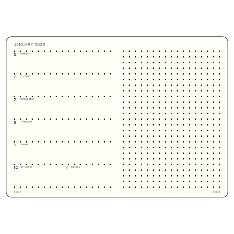 - Each double-page spread features one page with the planner week and one dotted notebook page