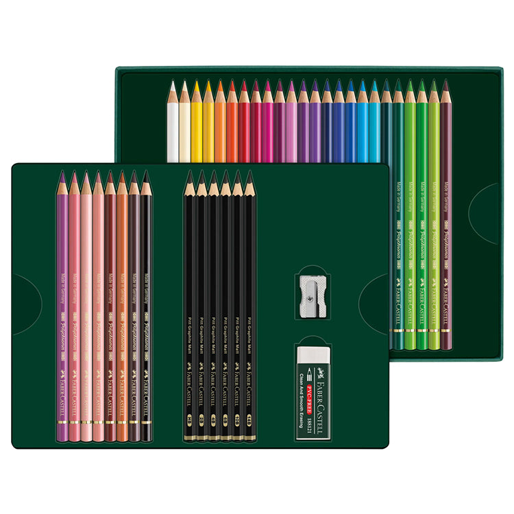 This complete set includes 32 Faber-Castell Polychromos Colored Pencils, 6 Pitt Graphite Matte Sketching Pencils, White PVC-Free Eraser, and a single hole metal sharpener with a high-grade sharpening blade.