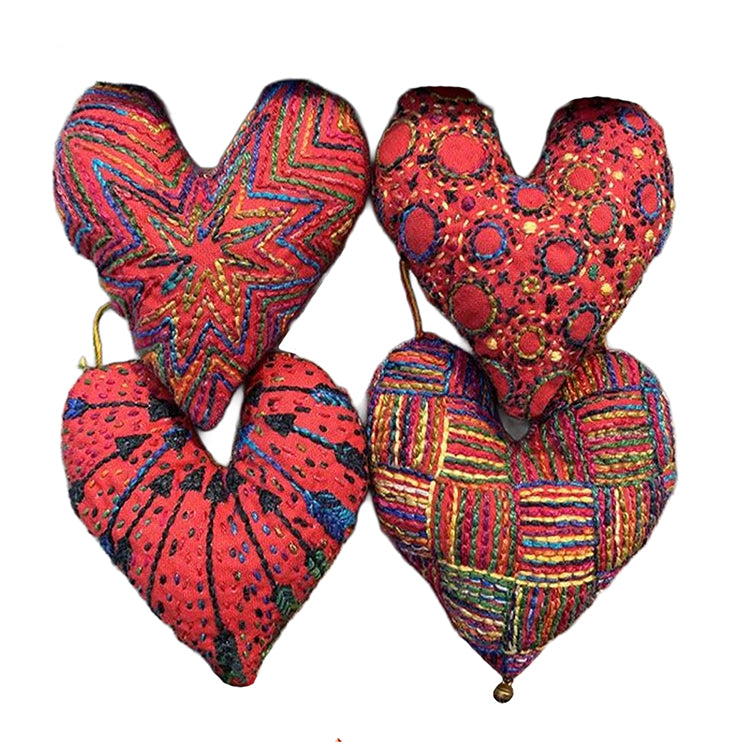 This sampler includes four heart panels for you to embroider by hand. They used back stitch, running stitch, satin stitch and french knots, but you can choose your own stitches to suit your own taste. For best results, they recommend using 3 strands of embroidery floss or size 8 perle cotton in your needles.
