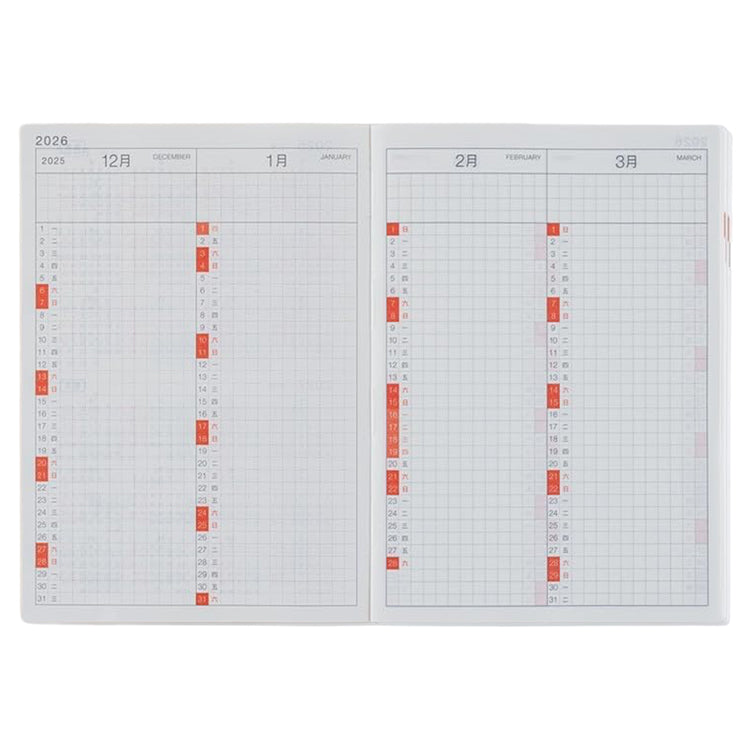 | Bonus Pages | Time Table / Graph Paper / Favorites / My 100 / Memories 2026 / 12 Switches to Help You Focus / For a Comfortable Night’s Sleep / Words to Remember / 365 Days Check-Off Sheet / Looking Back at the Year 2026 / Getting the Most Out of Your Hobonichi Techo / Gifts / Addresses / Personal Notes |