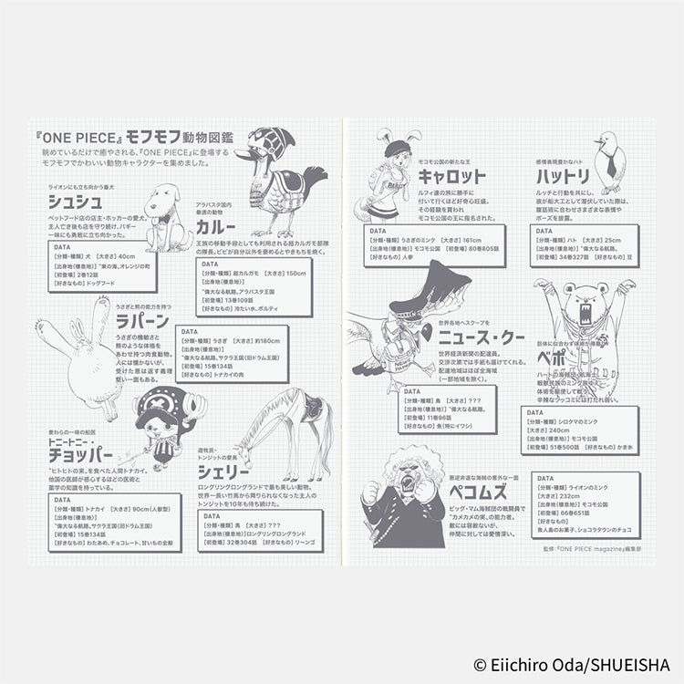 | Bonus Pages | One Piece Chronology / One Piece Trivia You’ll Want to Share Tomorrow / The Fluffy Animal Encyclopedia of One Piece / WANTED / Time Table / Favorites / My 100 / Solar Terms / Emergency Preparedness / Gifts / Age Table / Addresses / Personal Notes |