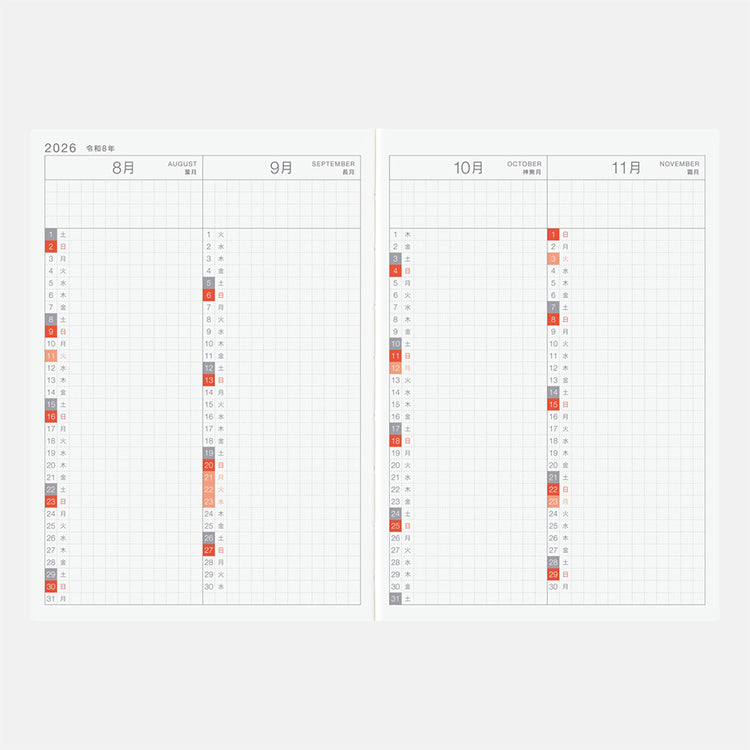 | Paper Type / Binding | Thin, light Tomoe River paper that is smooth to write on and designed for planners / Stitch-binding |