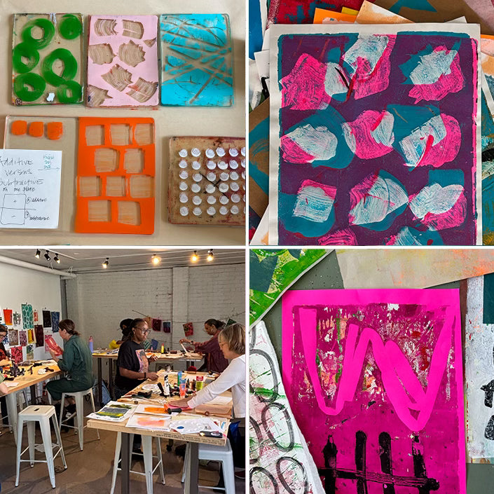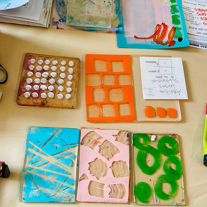 Never used a gelli plate before? Not to worry, this is the workshop for you. This workshop starts at the beginning by students learning and getting comfortable with what this tool can do. The time in the class is process focused with no ulterior motives. You won’t leave with a finished product from these sessions but you will leave with a stack of prints and tons of ideas on how you can use the gelli plate in your own art making going forward. This workshop is great for artists who need a few hours of creative play, as well as beginning printmakers who want an ease-filled introduction to the world of mono printing. We will create quick, no pressure mono prints on all kinds of paper using simple marks and symbols.